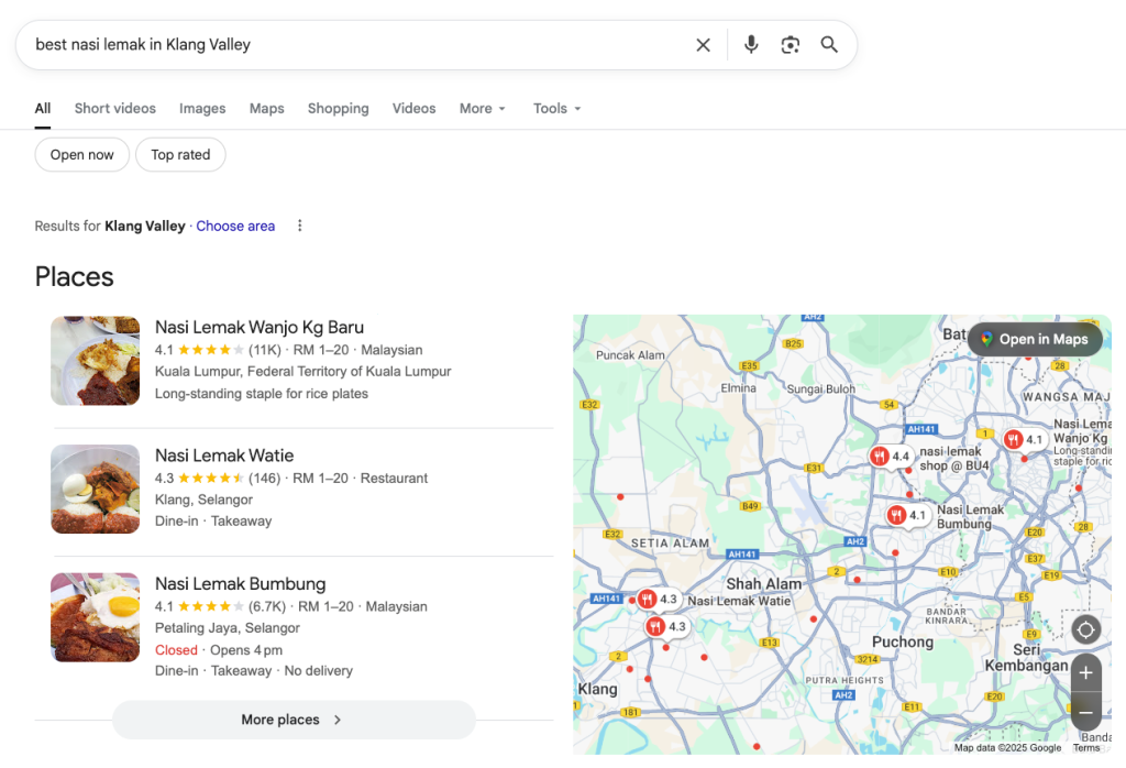 - Dual-language searching: English + Bahasa Malaysia queries both matter (e.g., “nasi lemak near me” vs. “kedai makan terbaik”).
