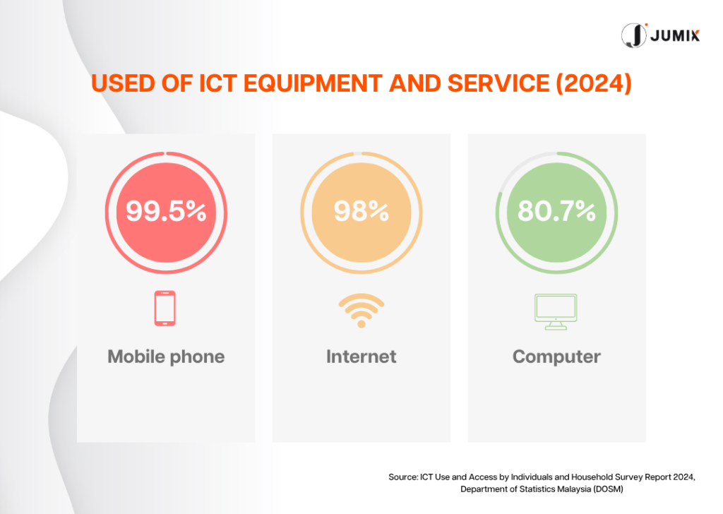 - 99.5% of Malaysians access the internet using mobile devices (Department of Statistics Malaysia).
