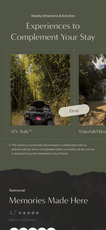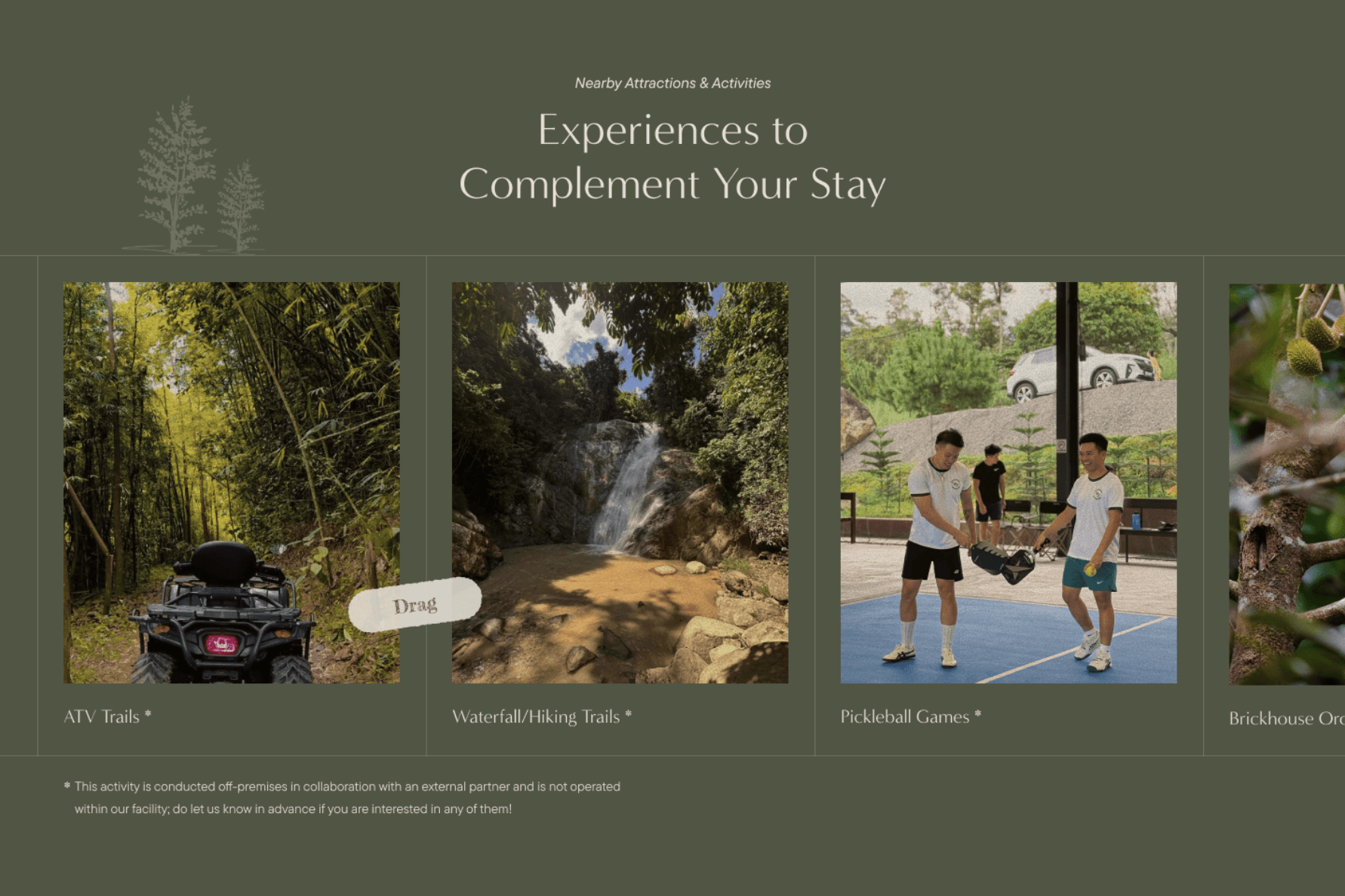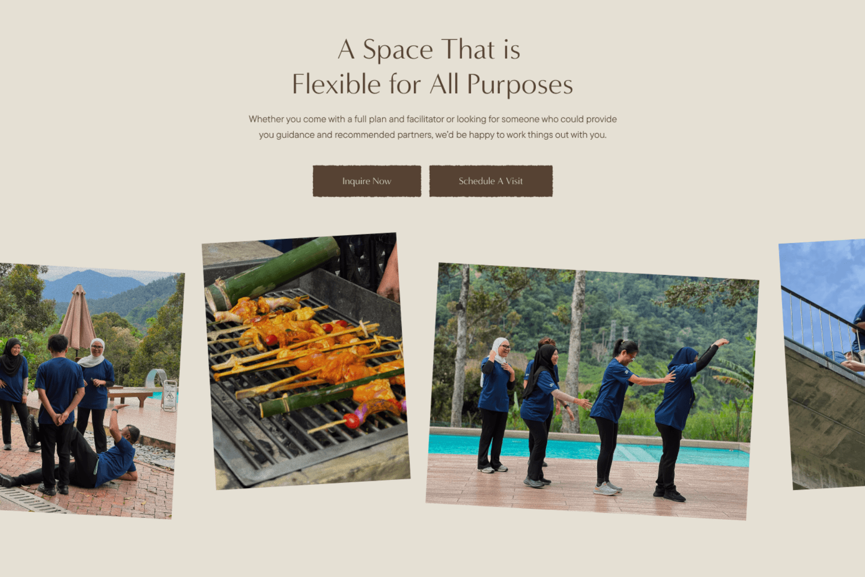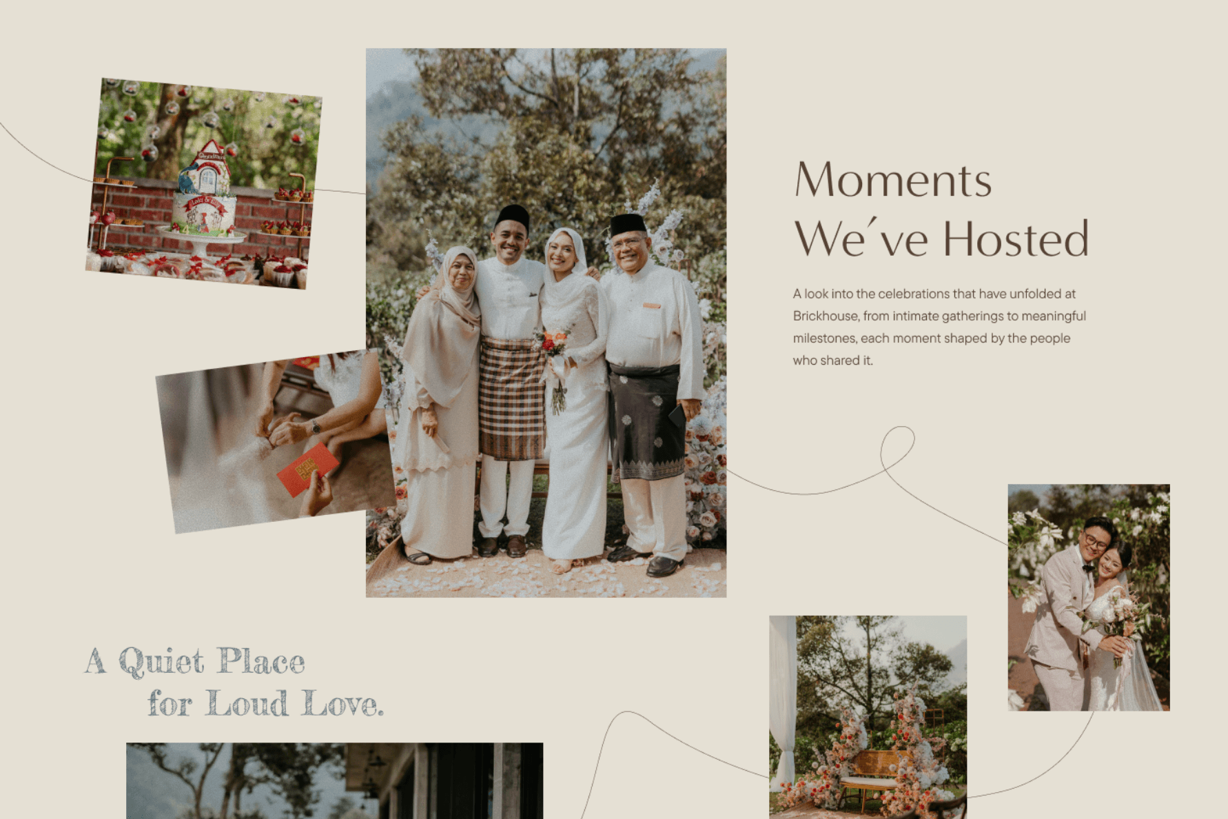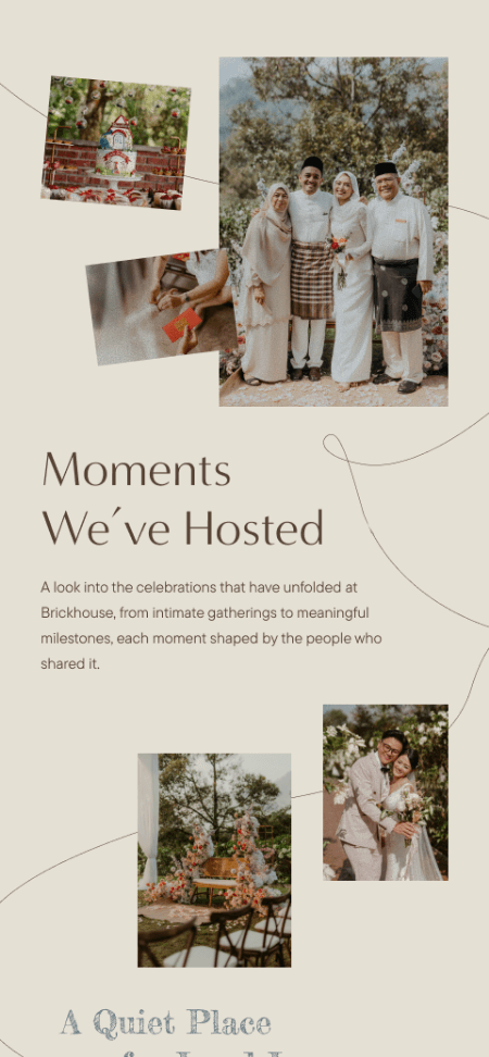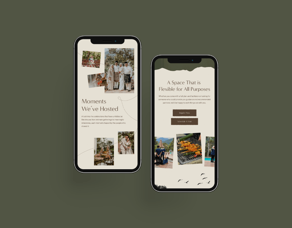 We approached this by focusing on storytelling as the core of the user experience. By understanding Brickhouse, a quiet, rustic retreat rooted in nature and community, we designed a journey that immerses users into its environment. Through carefully curated visuals and content flow, the website highlights real moments, from families gathering to events being hosted, while integrating essential information such as facilities, nearby activities, room rates, and event packages in a seamless and intuitive manner.