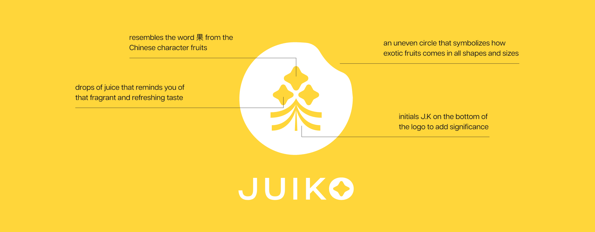 The primary logo mark for Juiko is a custom design that blends elements familiar to their products—exotic fruits. The shape of the logo is inspired by the Chinese character ‘果’ (meaning “fruit”), with the top part designed to represent drops of juice, evoking the refreshing taste of premium fruits. The initials “J” and “K” are subtly integrated at the bottom of the logo to add significance. The logo’s icon also symbolizes a gold coin, a nod to prosperity, and serves as a detailed greeting to Juiko’s customers, reinforcing a brand image that is both meaningful and visually clear.