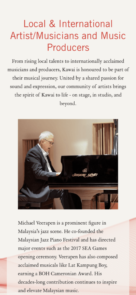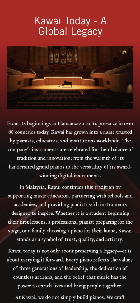 The final website delivers a refined and structured experience that balances heritage with usability. More than just an informational platform, it strengthens Kawai Piano’s brand presence, allowing users to better appreciate its legacy while supporting its role across retail, education, and dealership networks.