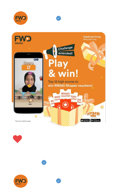 We personalized social media challenges to maintain a competitive spirit among gamers. The #KomunitiChallenge encourages players to achieve high scores and answer takaful and personal finance literacy questions they learned from the game on social media. Leveraging the AR filter we created on Instagram, we used it as the main medium for these challenges.