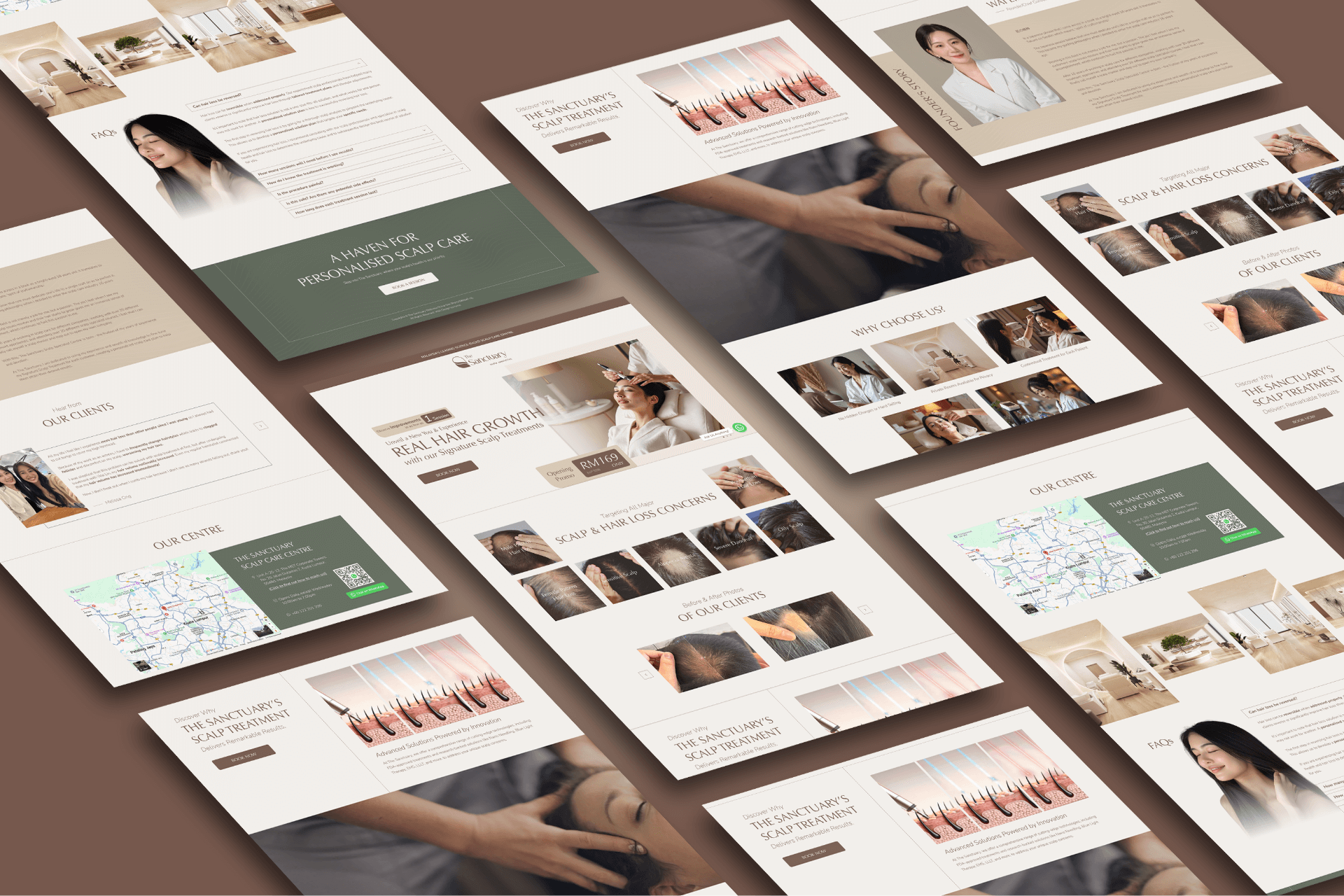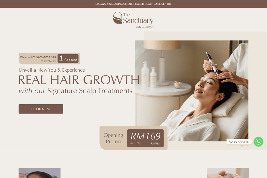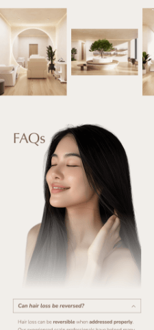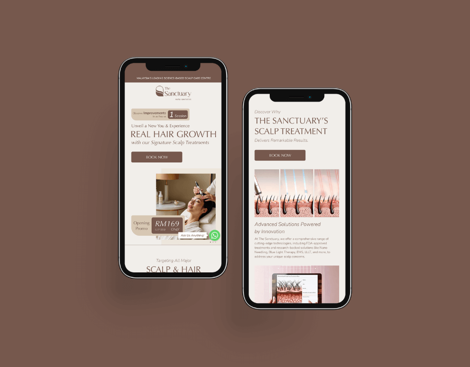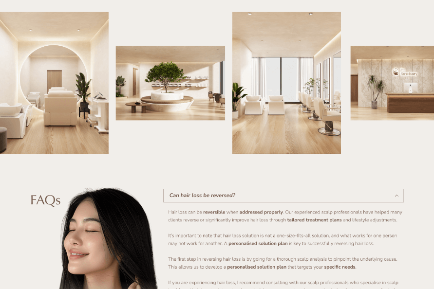 Visually, the landing page reflects the actual scalp care centre experience. Calm tones, clean layouts, and soft visual flow create a sense of serenity and comfort, aligning the digital experience with the physical space clients will step into. The result is a landing page that not only converts effectively, but also reassures potential customers that they are in experienced, trustworthy hands.