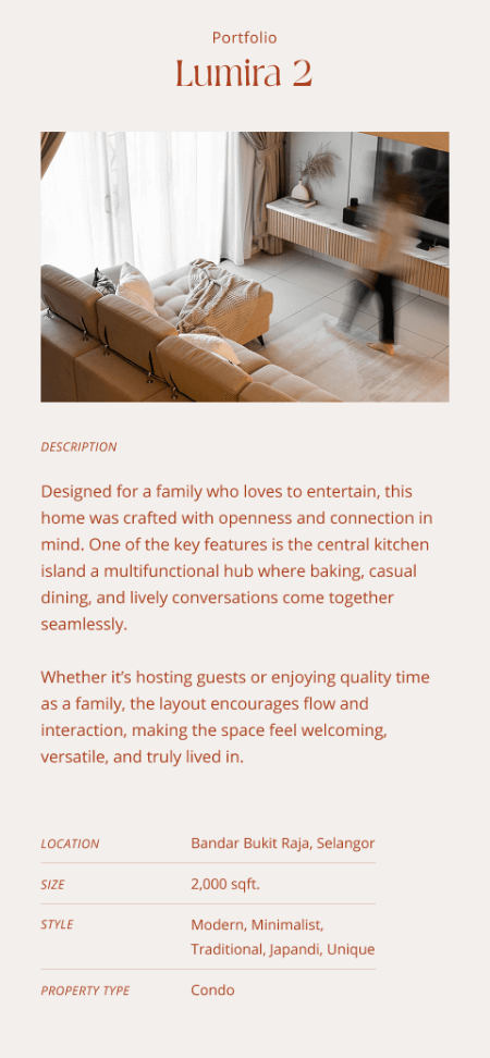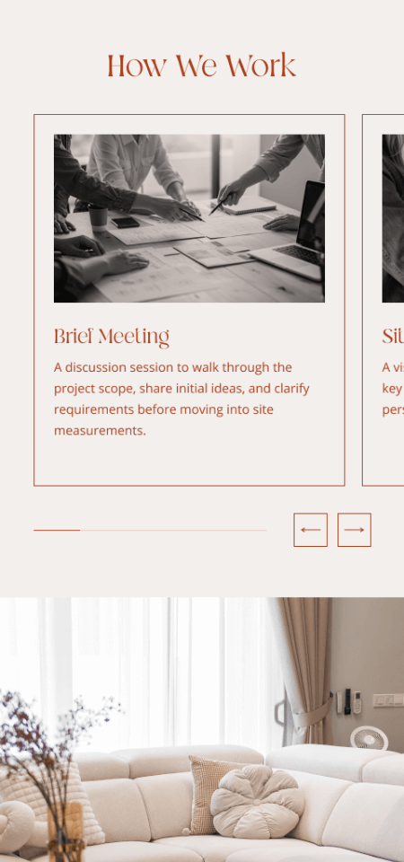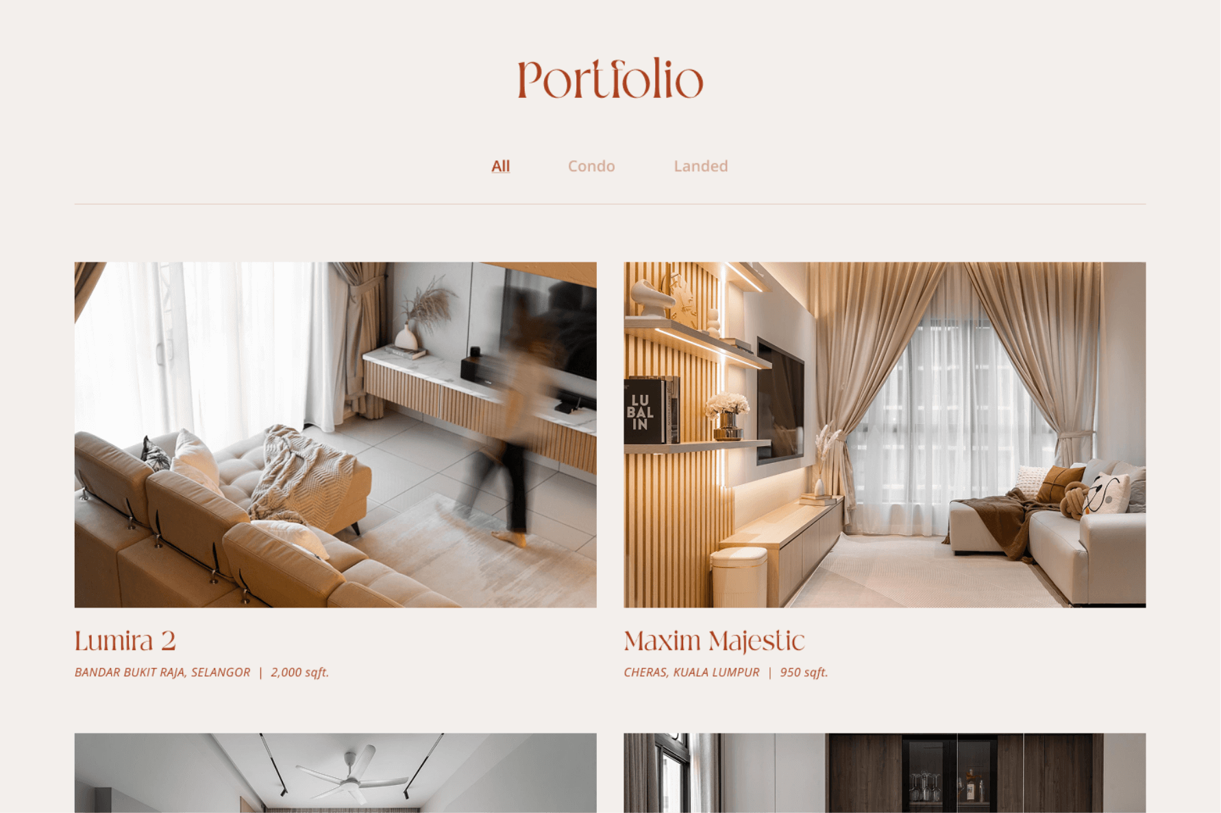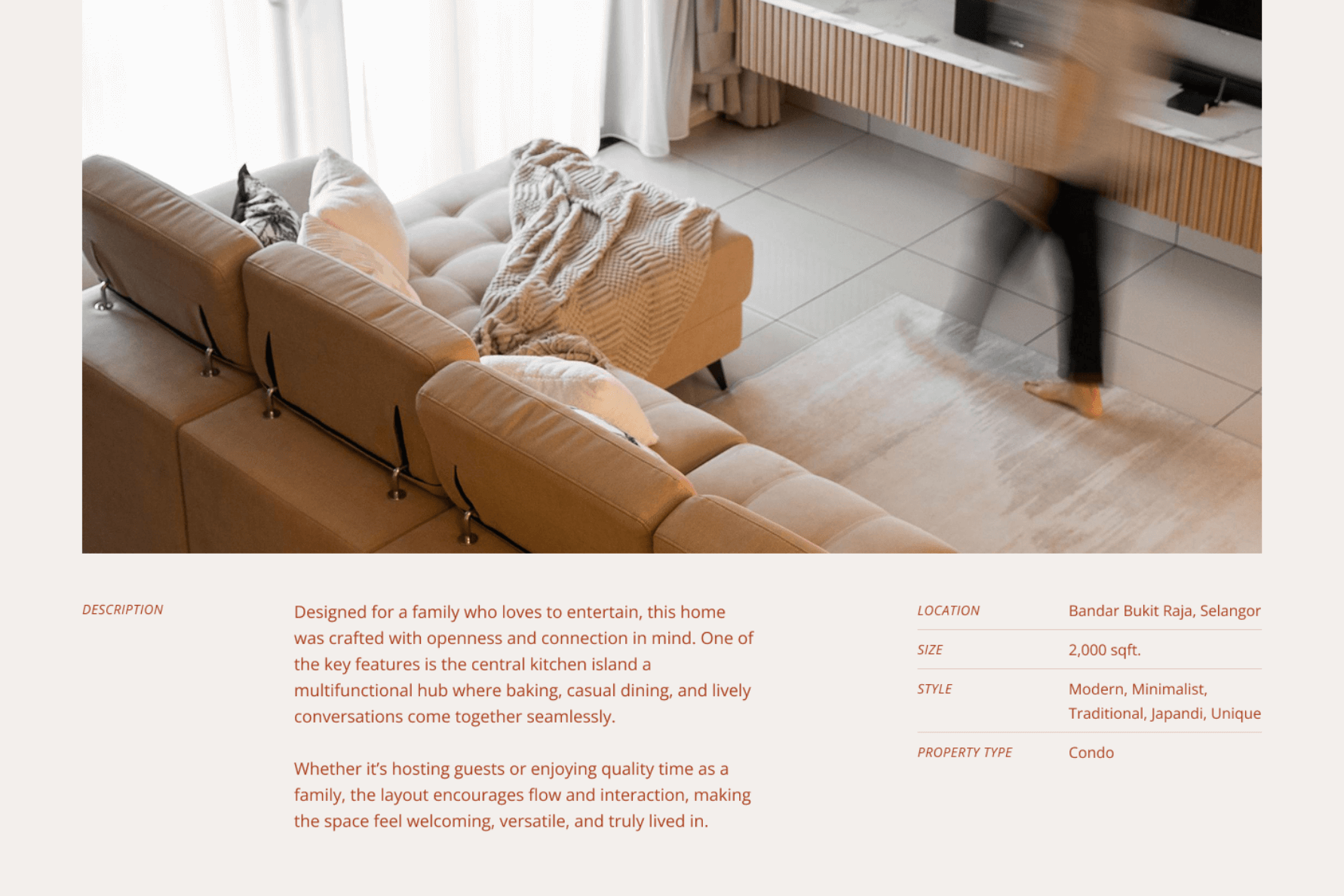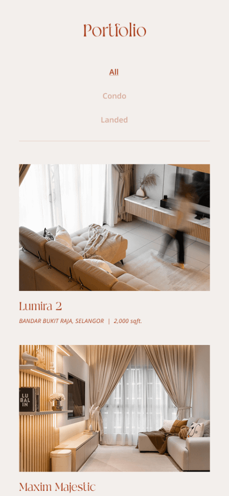 We crafted a clean, confident, and aesthetically curated website that serves as the brand’s new digital home. Every section was intentionally designed with generous white space, fluid transitions, and intuitive navigation, allowing their interior design work to shine without distraction.