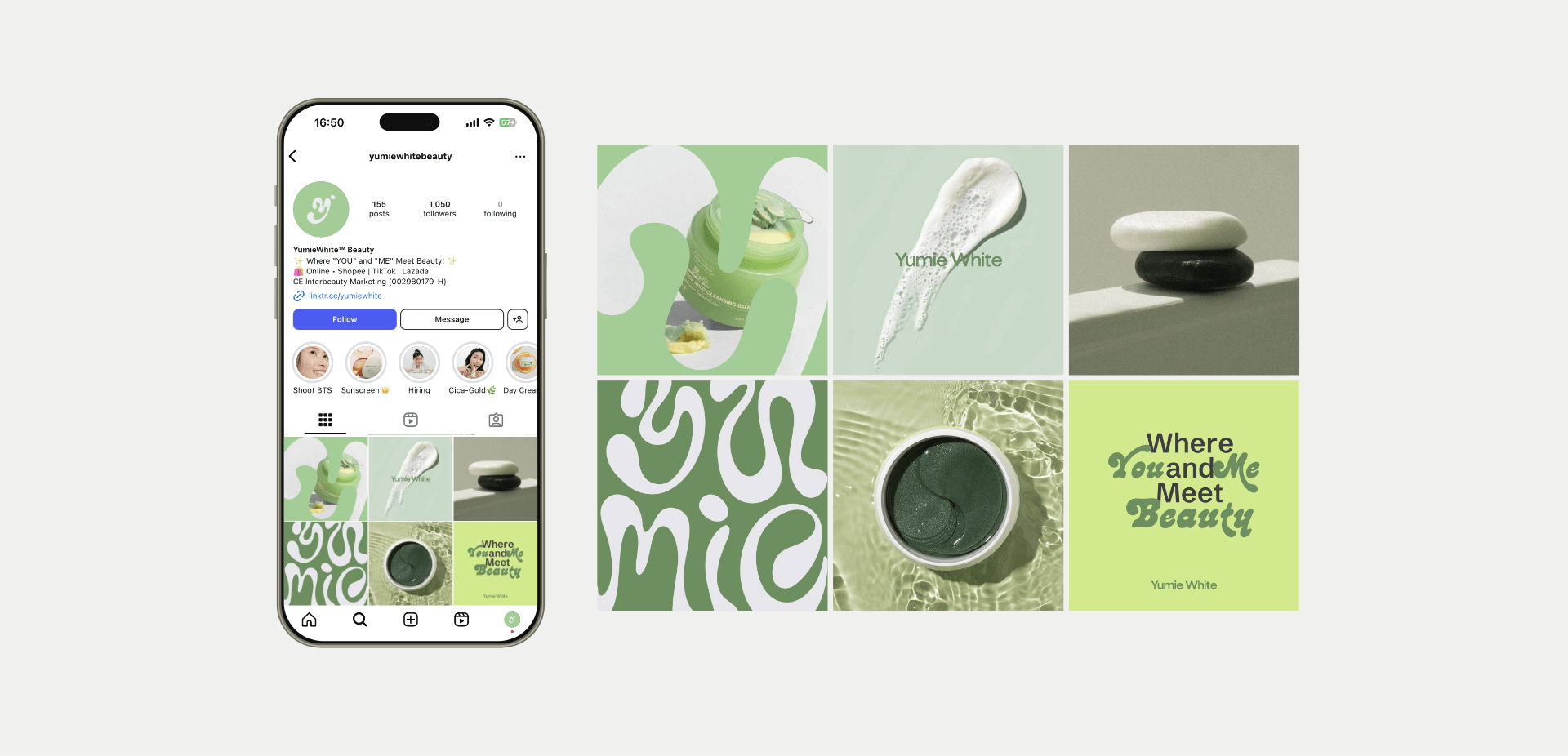 Yumie White’s primary brand colour is a soft, refreshing light green—a deliberate choice to reflect the brand’s values of purity, balance, and natural care. This shade evokes a sense of cleanliness and serenity, aligning with the brand’s promise of gentle, science-backed skincare. The colour also represents Yumie White’s cruelty-free stance and its use of natural ingredients. Supporting design elements are kept minimal and clean, allowing the brand’s story and product benefits to take center stage while maintaining a consistent tone of quiet confidence and modern femininity.