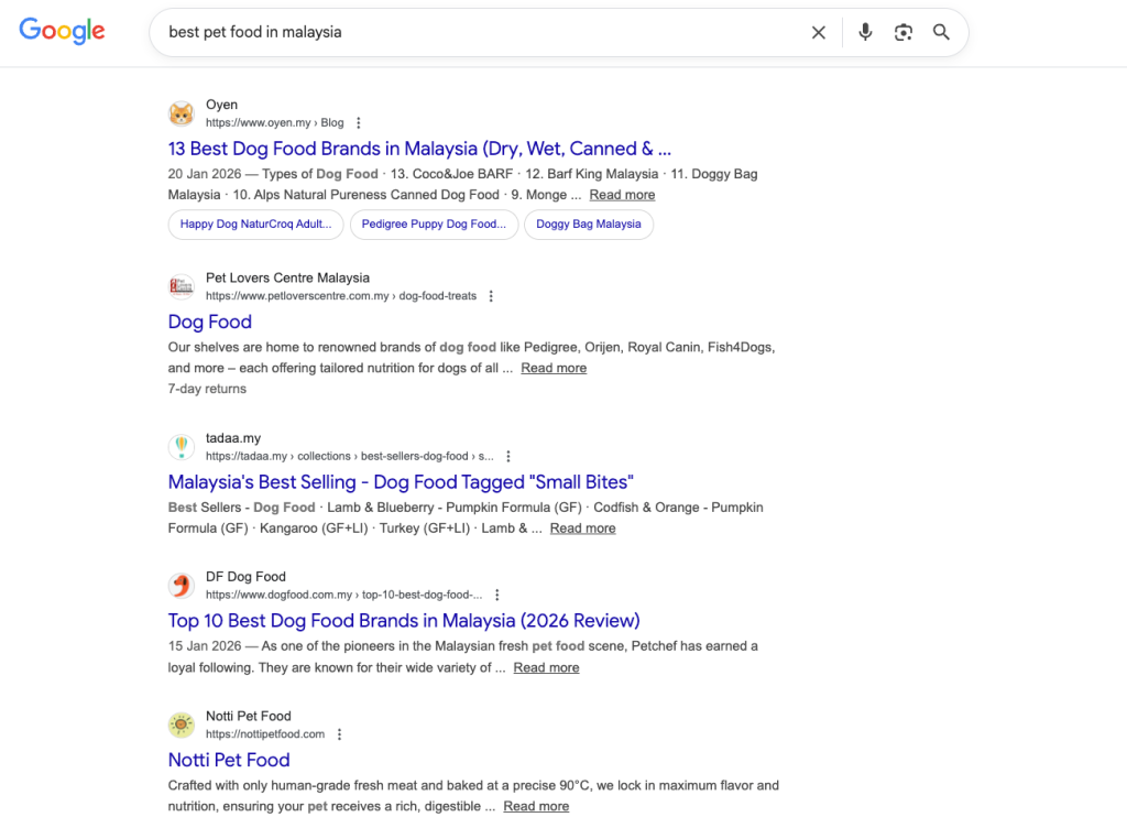 When someone Googles “best pet food in Malaysia” and your brand appears on page one without paying for that click, that’s SEO doing its job.